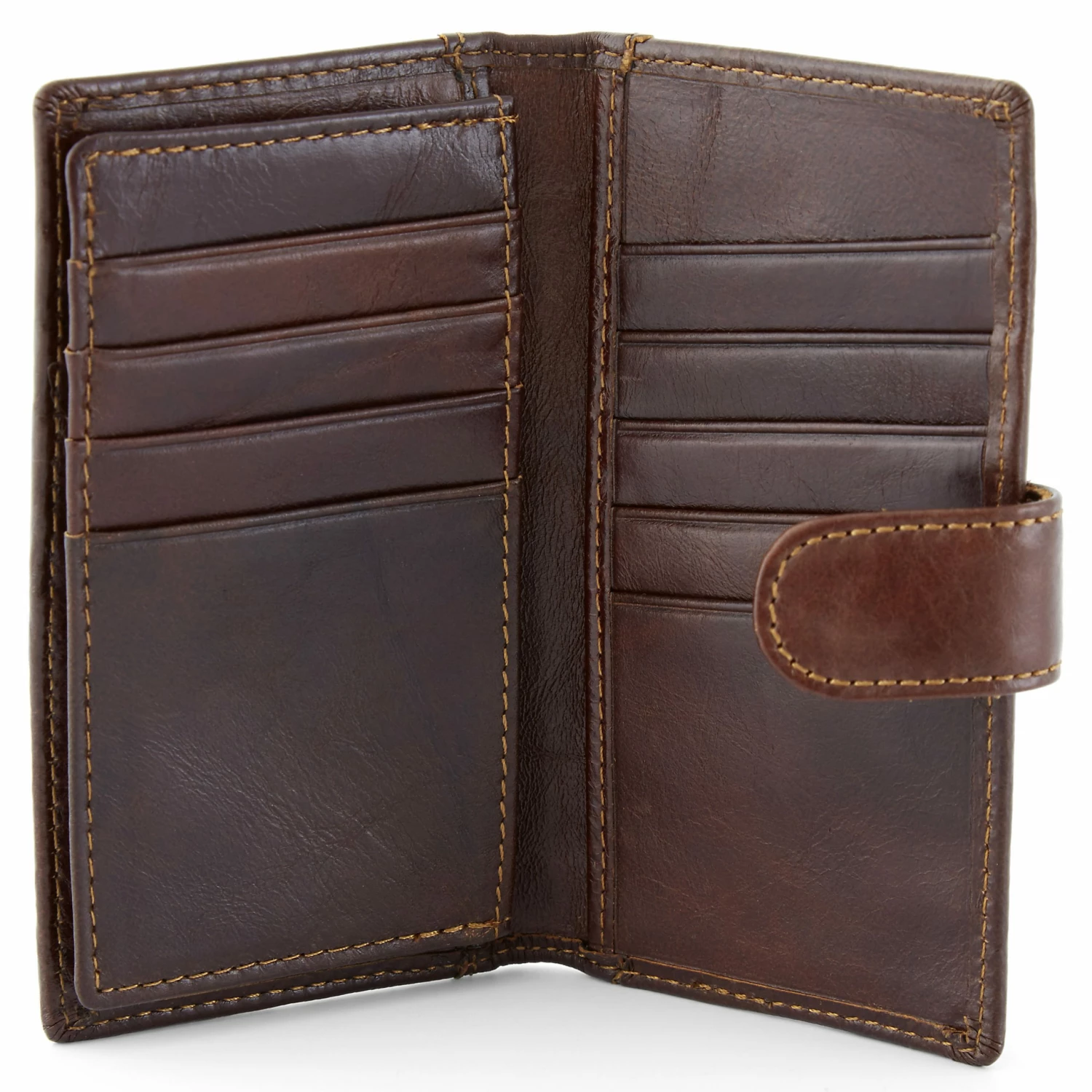 Opens into a bi-fold design with an extra middle panel. It’s got 14 card slots, each holding up to 2 cards. Two slip pouches provide easy access for bills and receipts, and an ID window completes the package.