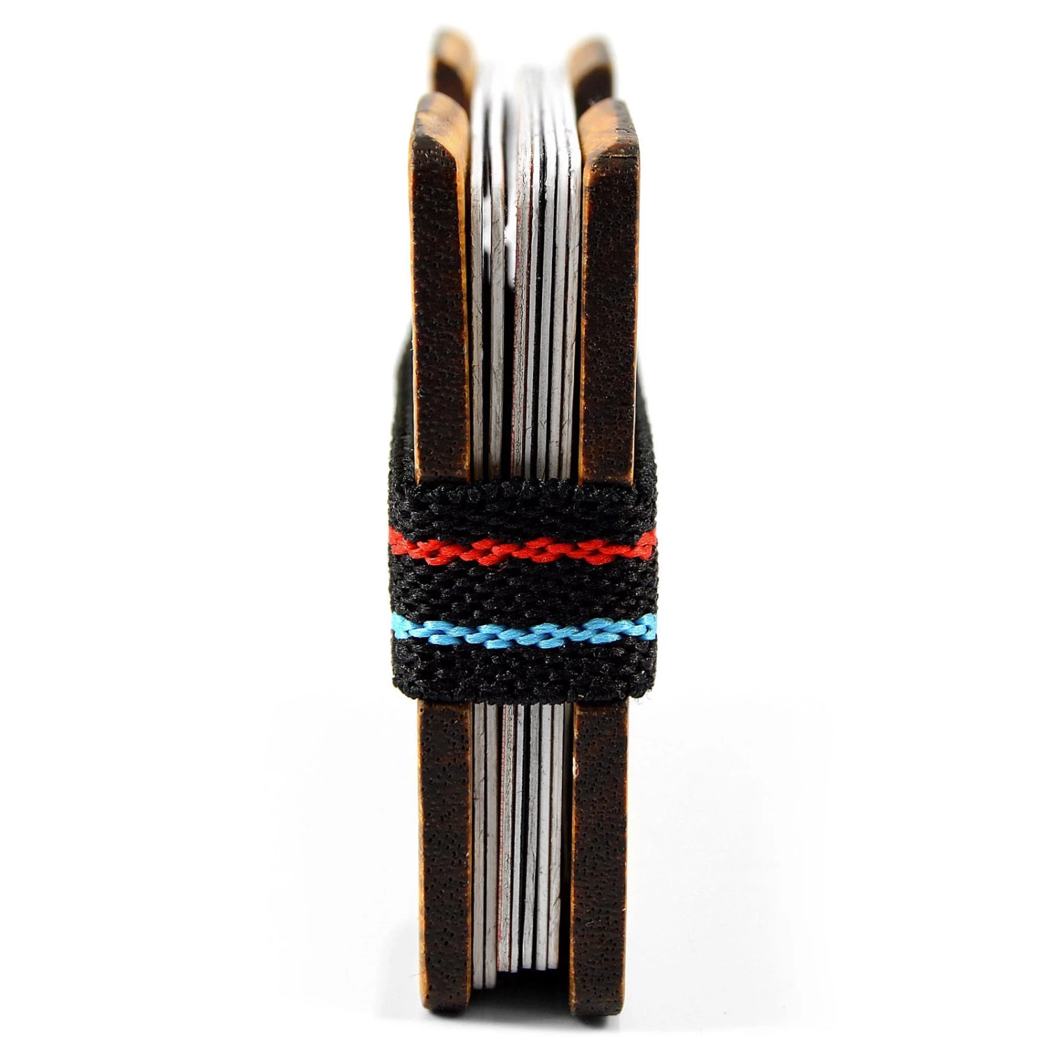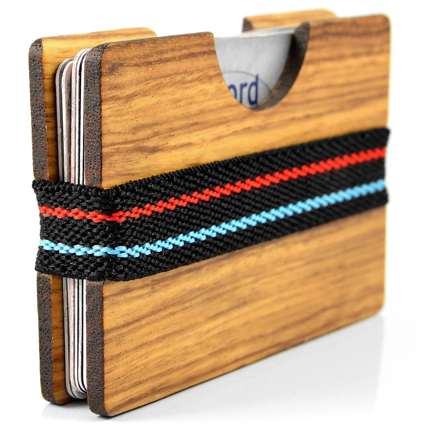Hereโs a practical cardholder in a minimalist wooden design. Two pieces of solid zebra wood are held together by a strong, black elastic band with rough contrasting stitching.
