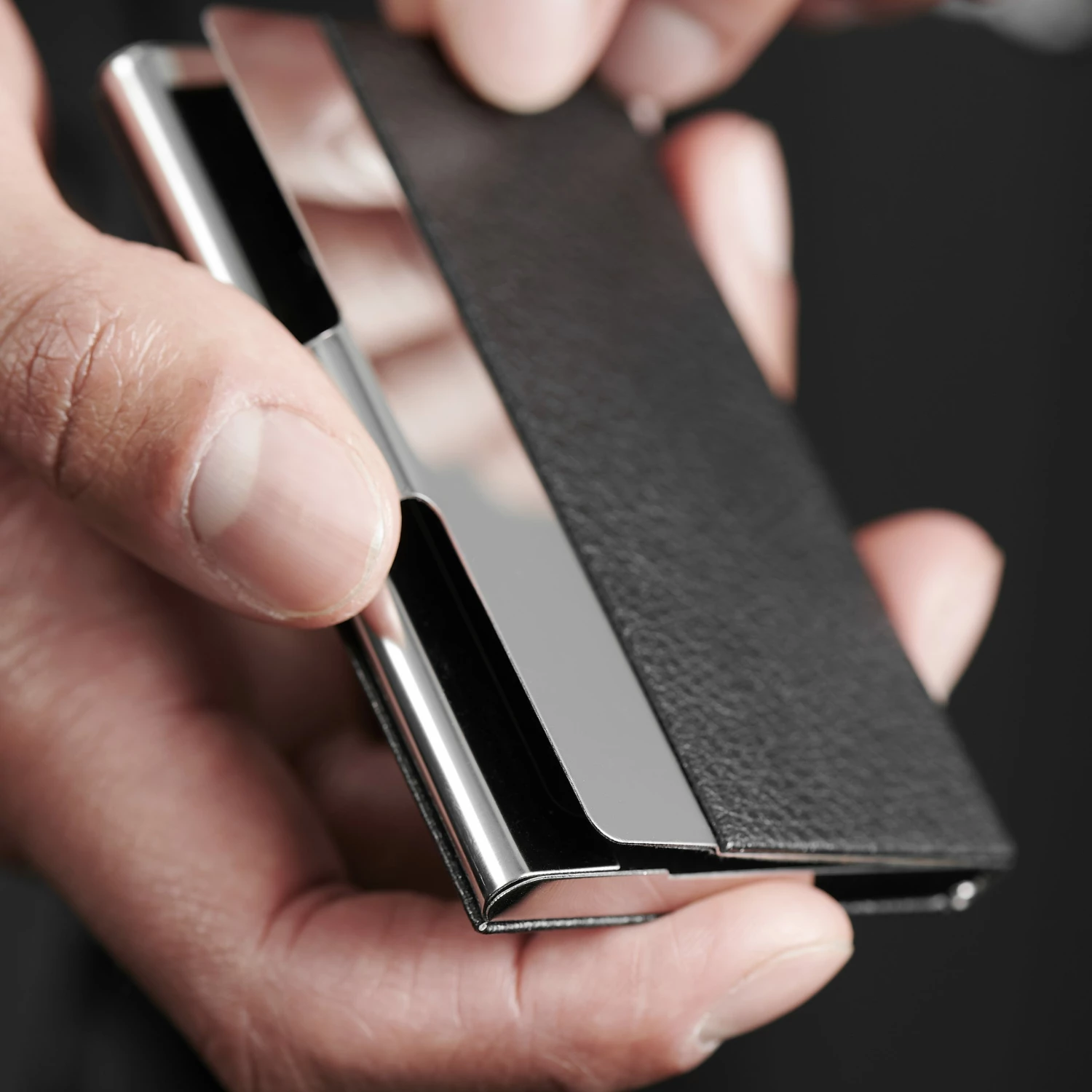 The marriage of black genuine leather and shiny stainless steel is an elegant one.