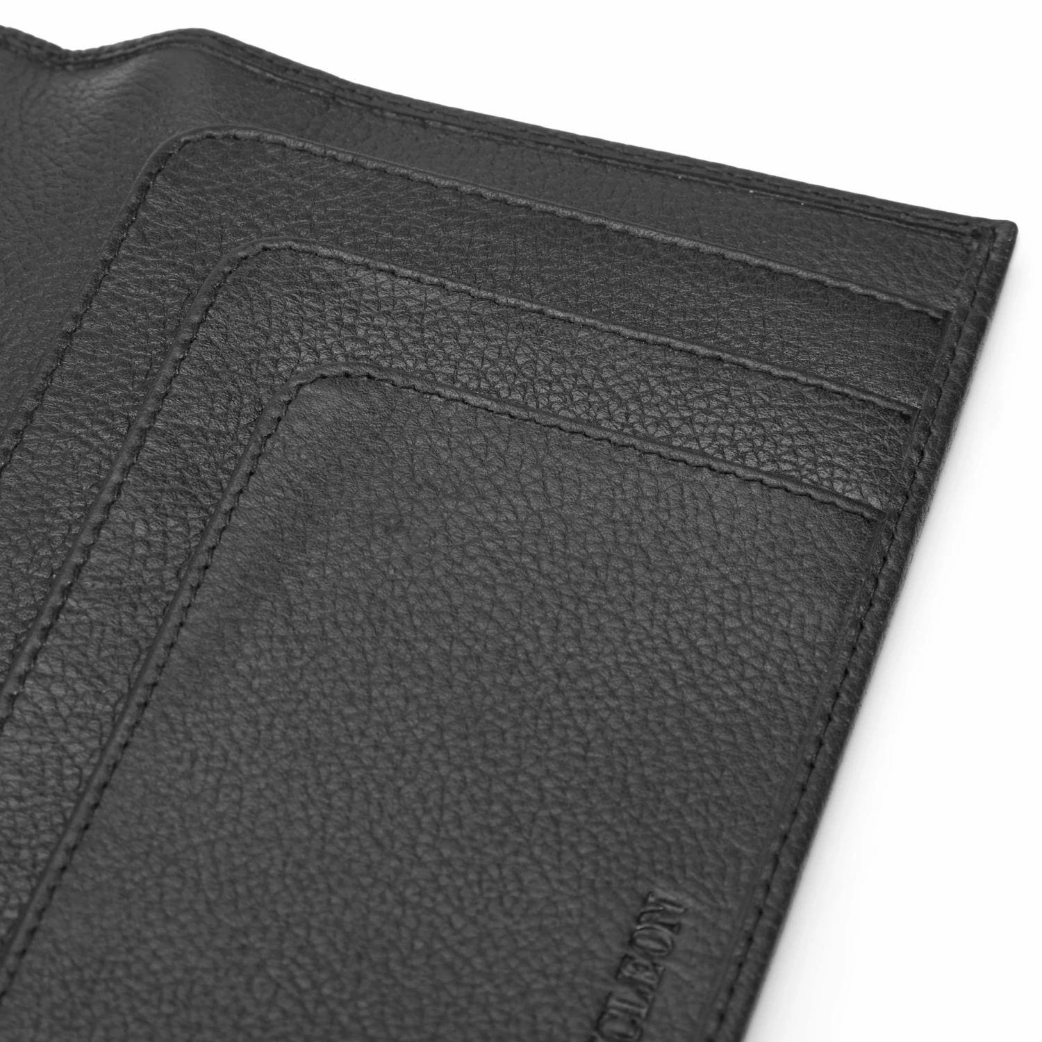 This black leather travel wallet is crafted in genuine leather and finished with a pebble grain for a distinct look and texture.