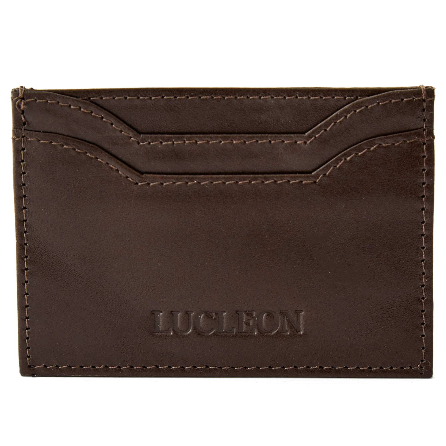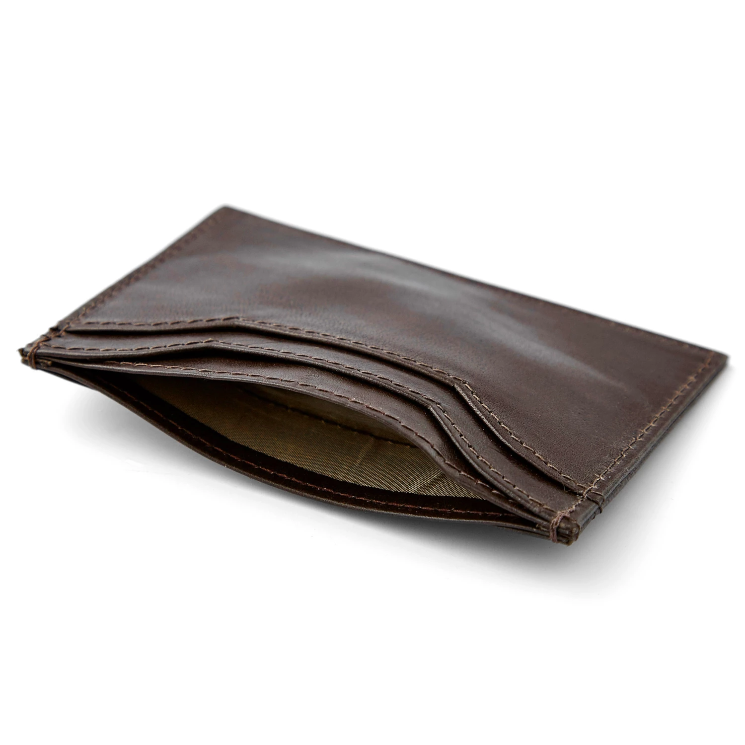 Features 4 card slots and a center compartment for bills. Constructed with durable brown leather and is Lined with RFID blocking fabric to keep your cards secure.