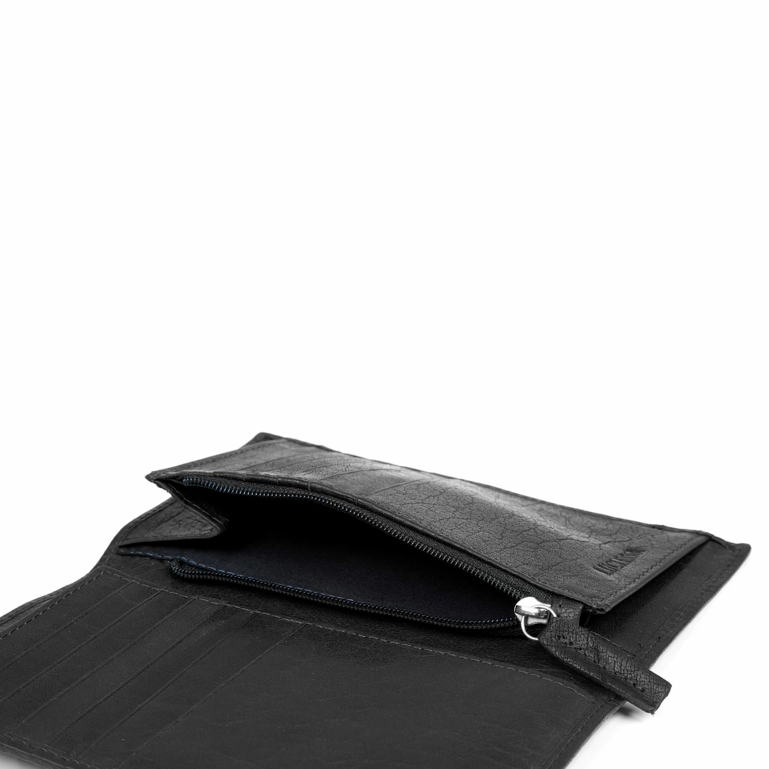 This is the tallest wallet in the collection, ideal for deep pockets. The elegant two-fold design opens into 12 2-card slots. Use the zip-locked coin pocket and the open container for bills and receipts for your cash.