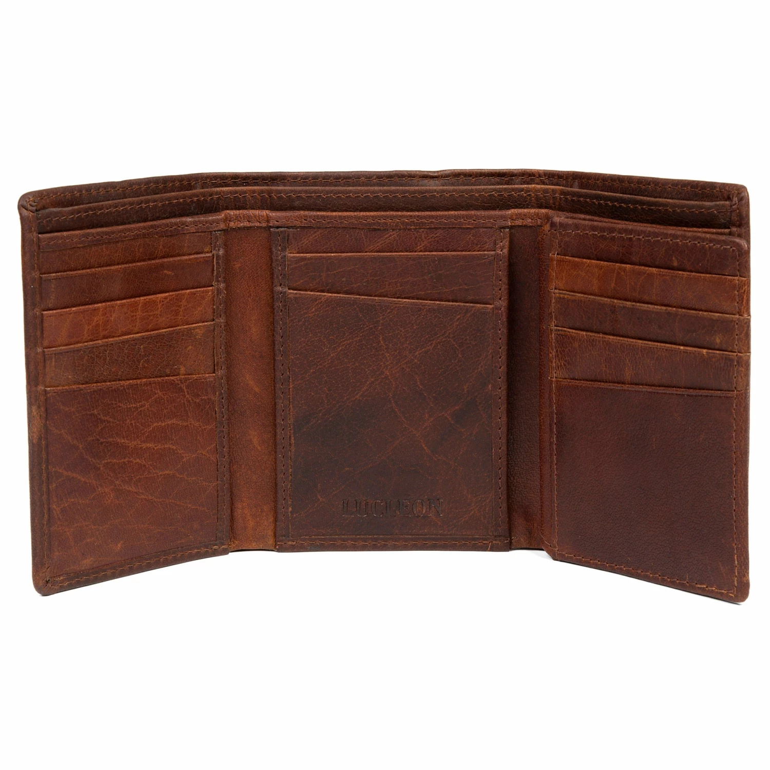 This carry-all wallet contains an amazing 14 2-card slots, an ID window, and a divided bill compartment, arranged in a three-fold design.