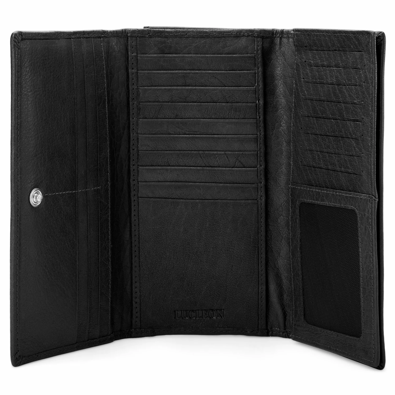 This trifold wallet opens to reveal 24 slots for your credit cards. Each slot fits two cards. Your ID stays visible behind a mesh screen in a designated spot. Three slip pockets for banknotes and such are also included.